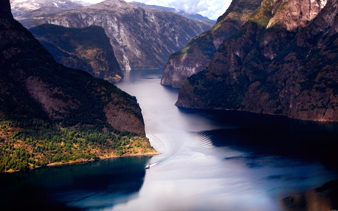 «Лодка на реке среди высоких гор»