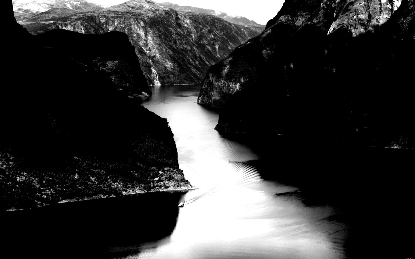 «Лодка на реке среди высоких гор»