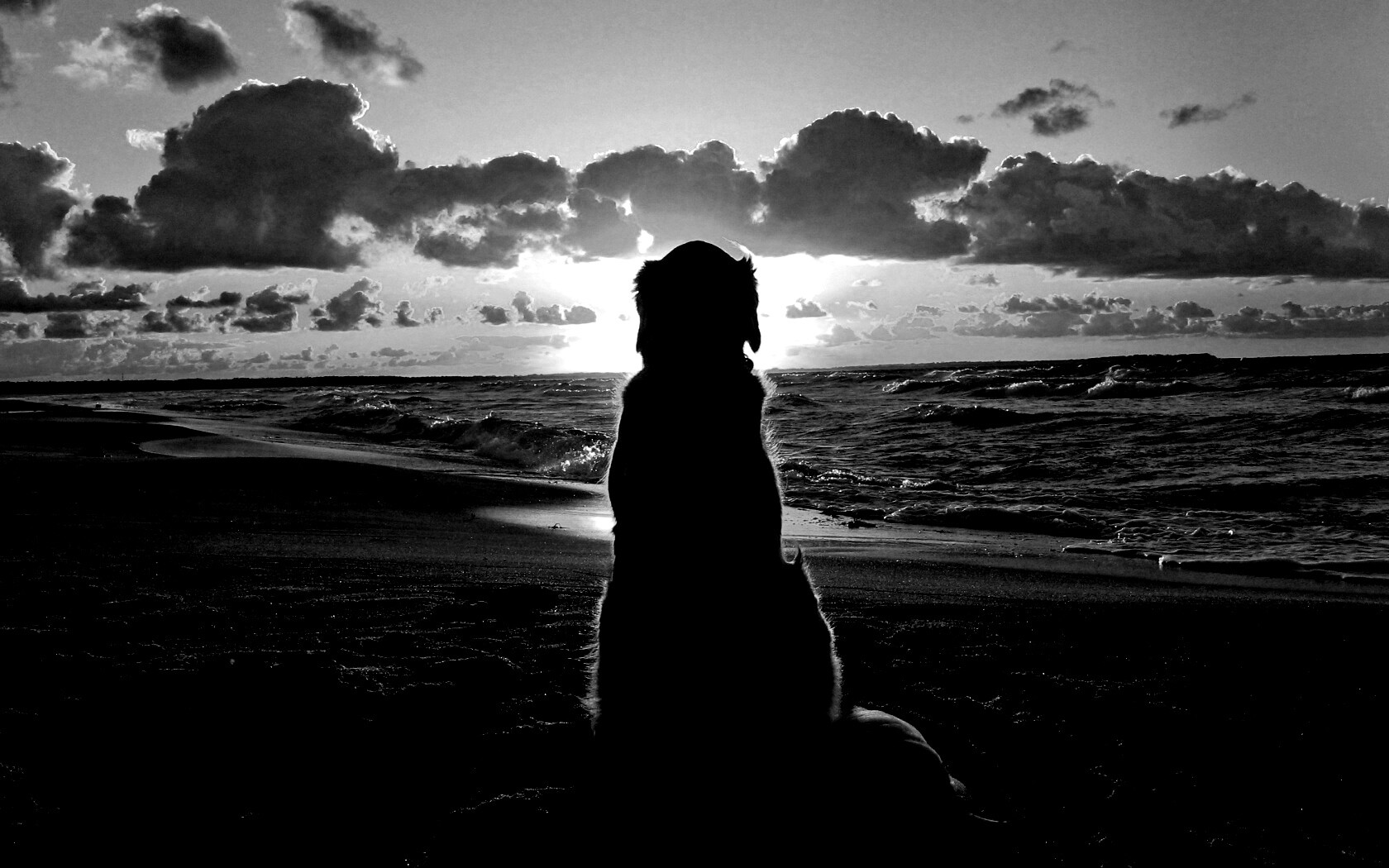«Собака наблюдающая закат на пляже»