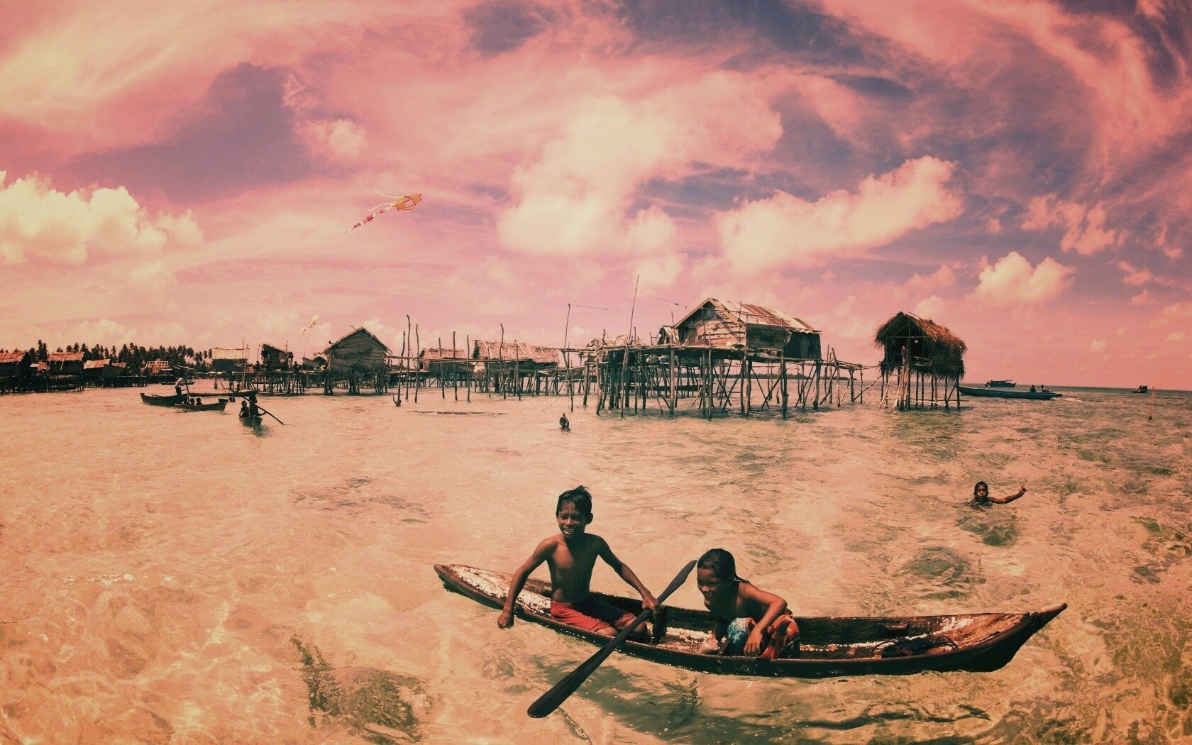 «Дети в лодке у поселения туземцев»