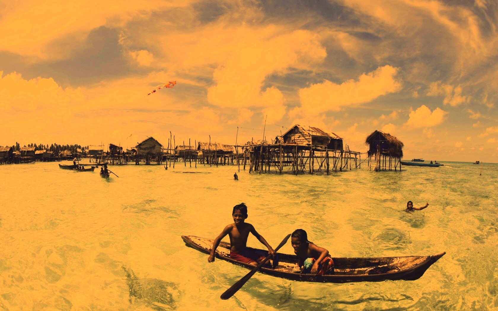 «Дети в лодке у поселения туземцев»