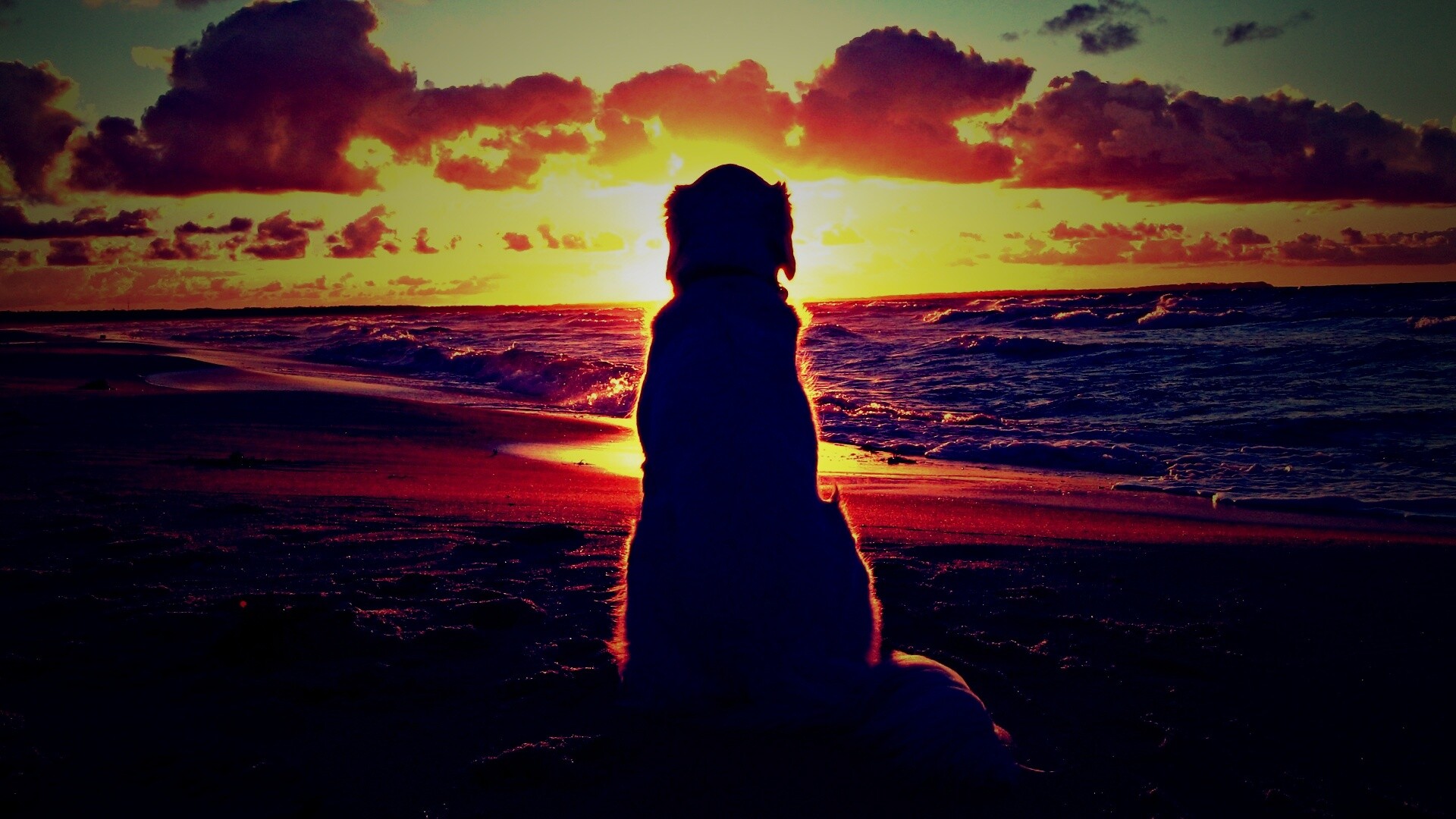 «Собака наблюдающая закат на пляже»