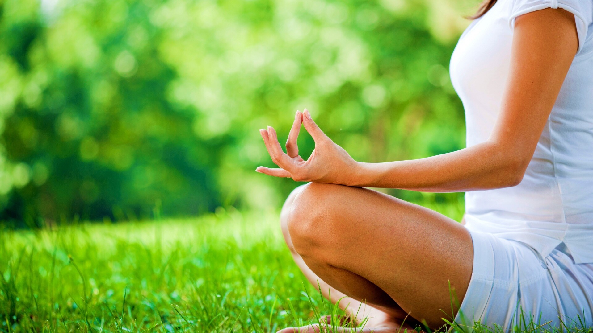 «Девушка медитирует в позе лотоса на траве»