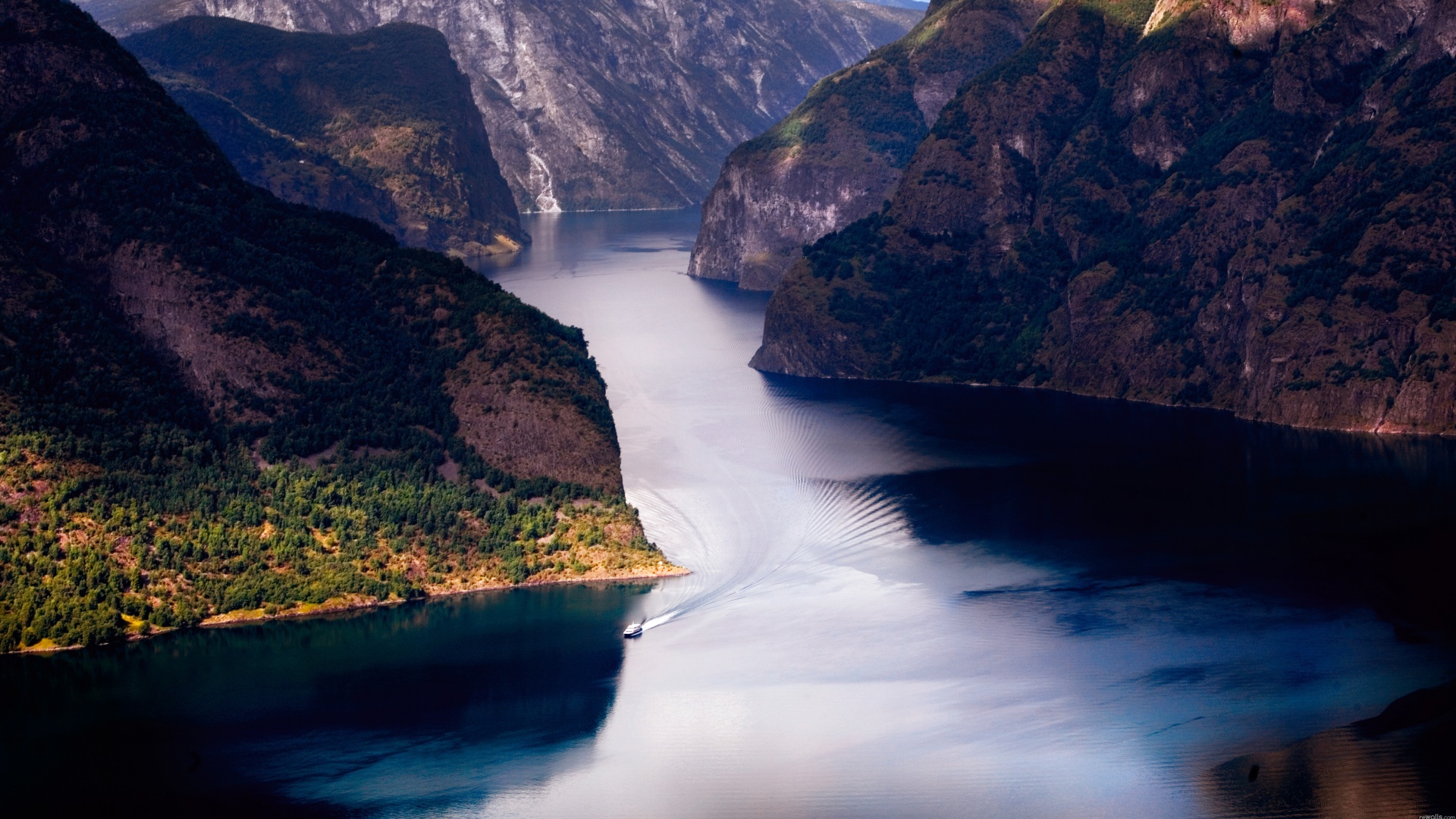 «Лодка на реке среди высоких гор»