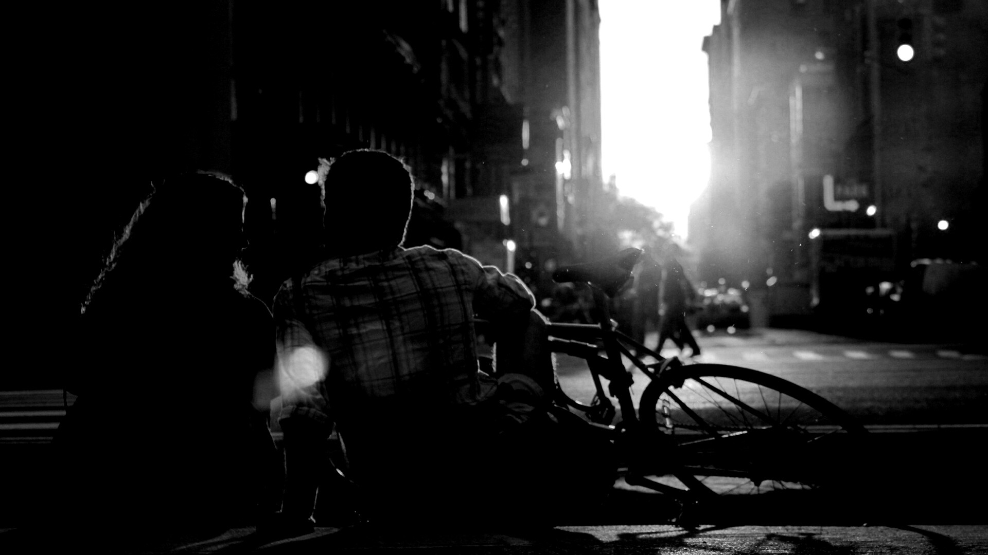 «Девушка и парень с велосипедом на закате»