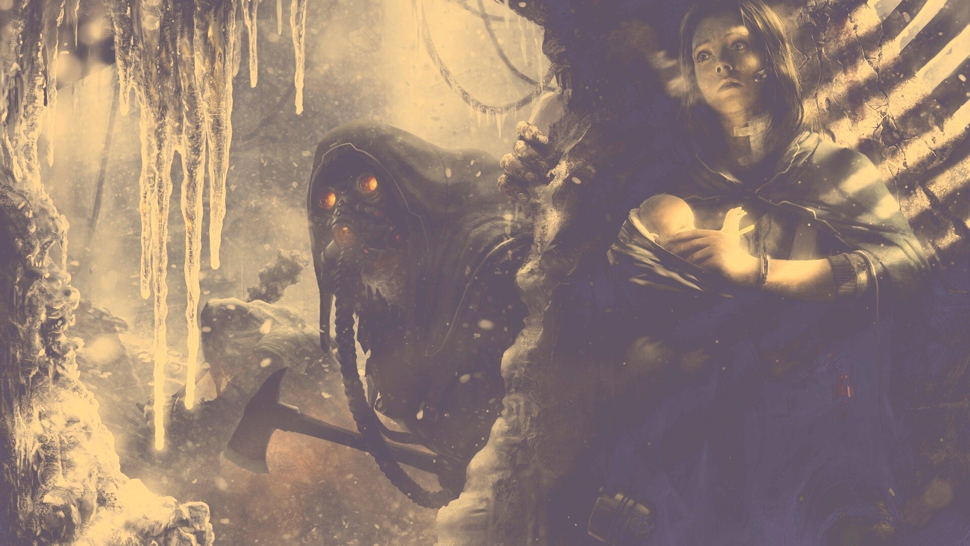«Девушка с ребенком прячется от монстра»
