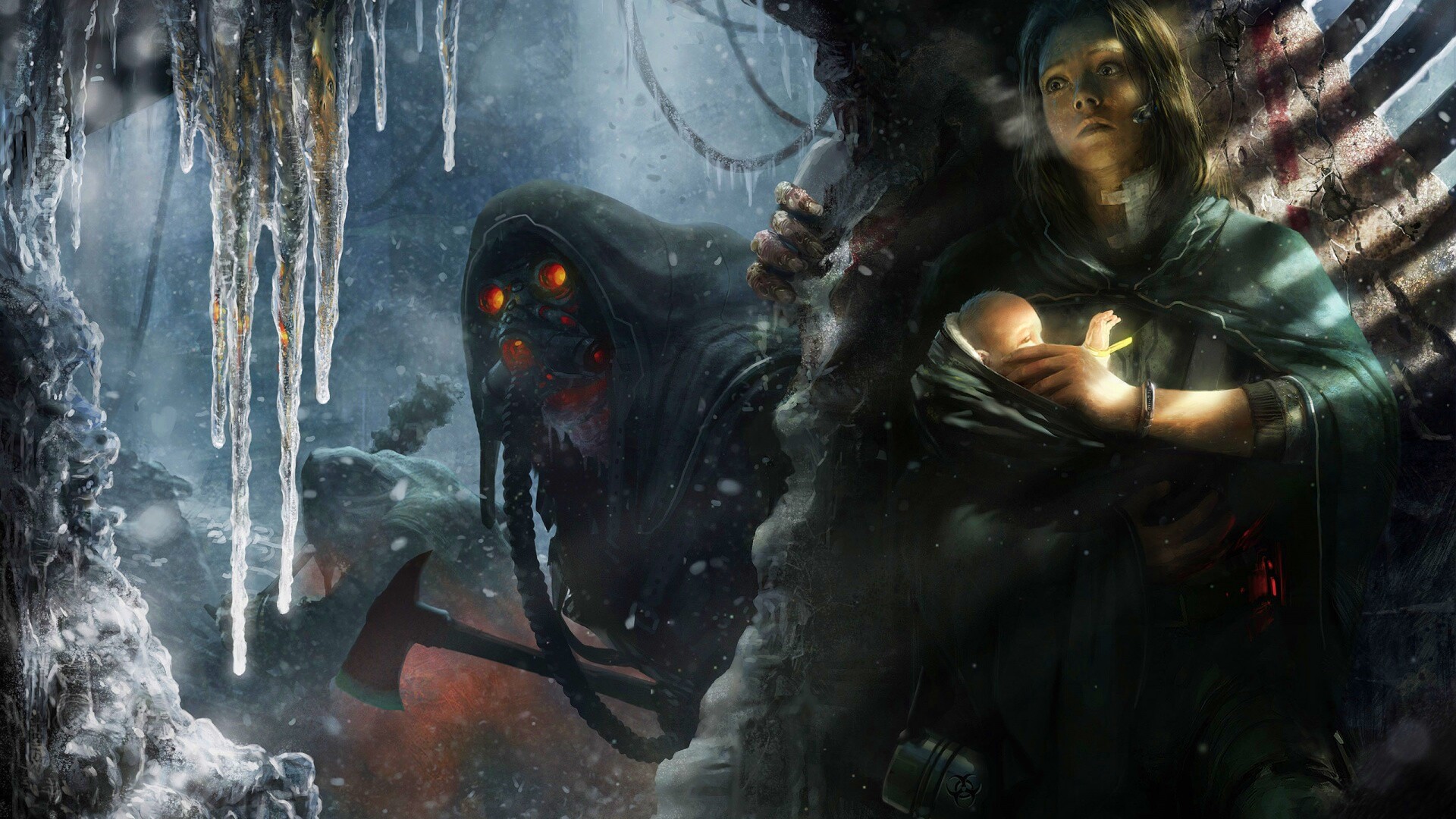 «Девушка с ребенком прячется от монстра»