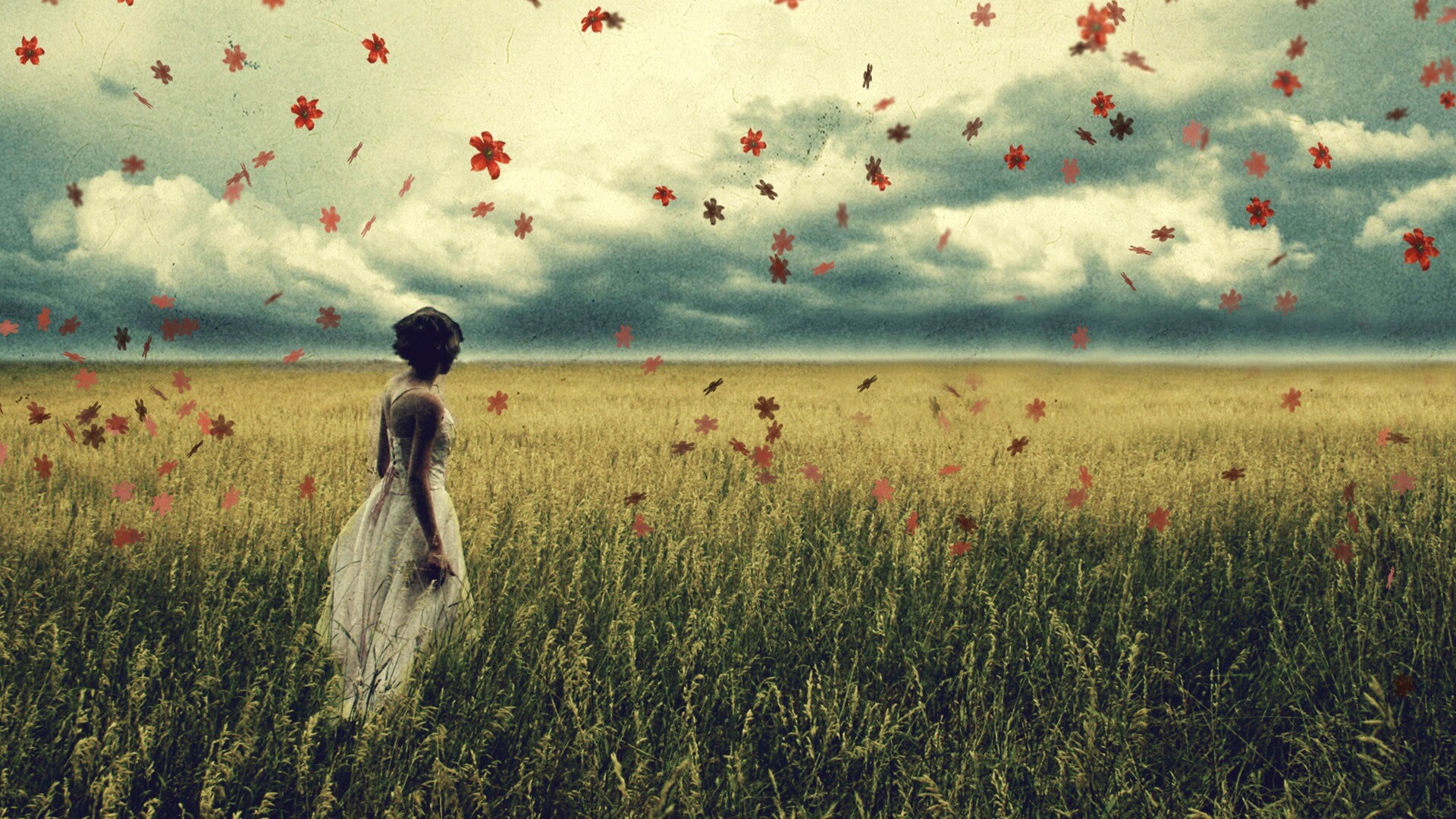 «Грустная девушка в поле травы»
