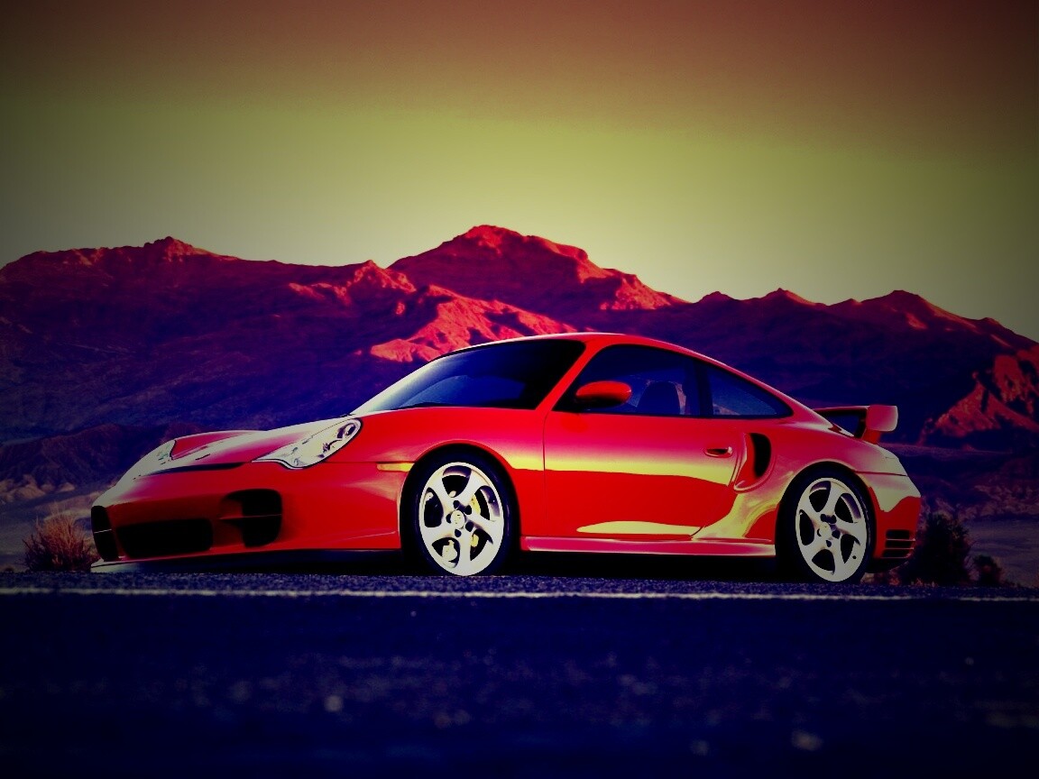 «Красный Порше на фоне гор»