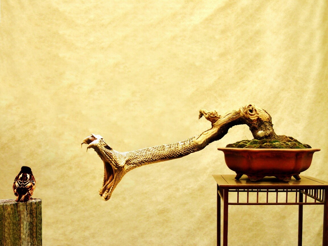 «Змея-коряга напдает на птичку»
