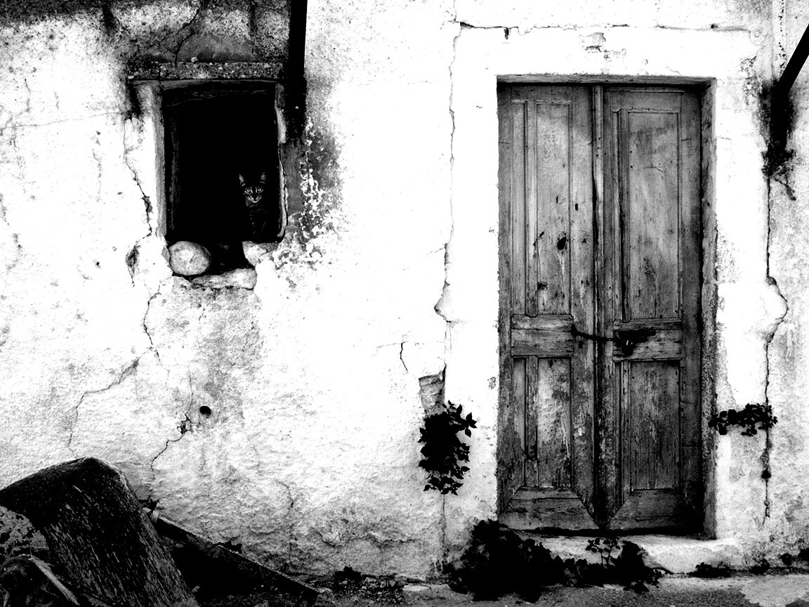 «Кот выглядывает из разрушенного дома»