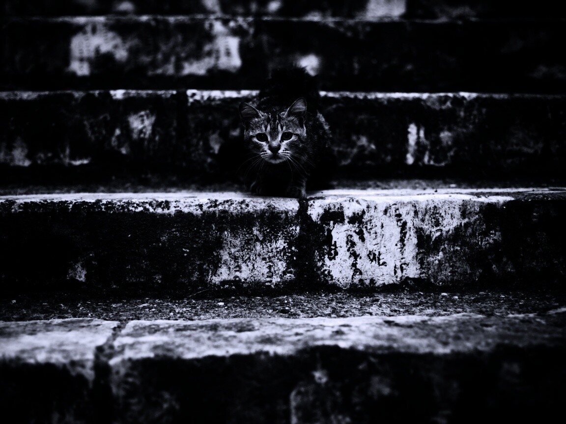 «Растрепанная кошка на ступеньках лестницы»