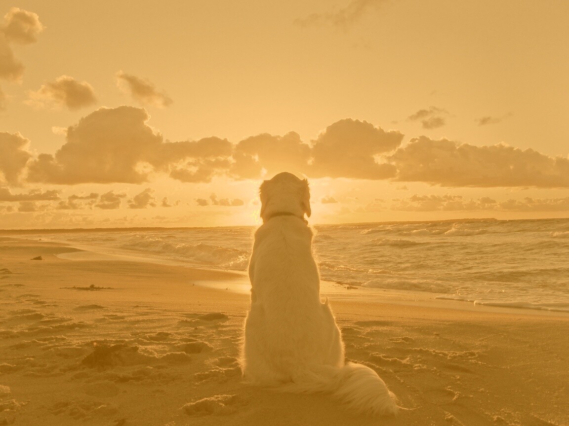 «Собака наблюдающая закат на пляже»
