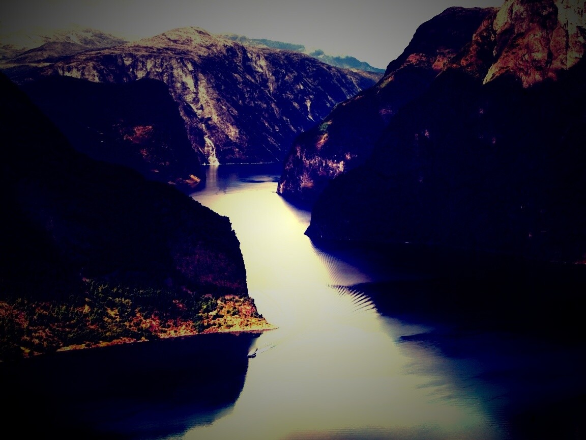 «Лодка на реке среди высоких гор»
