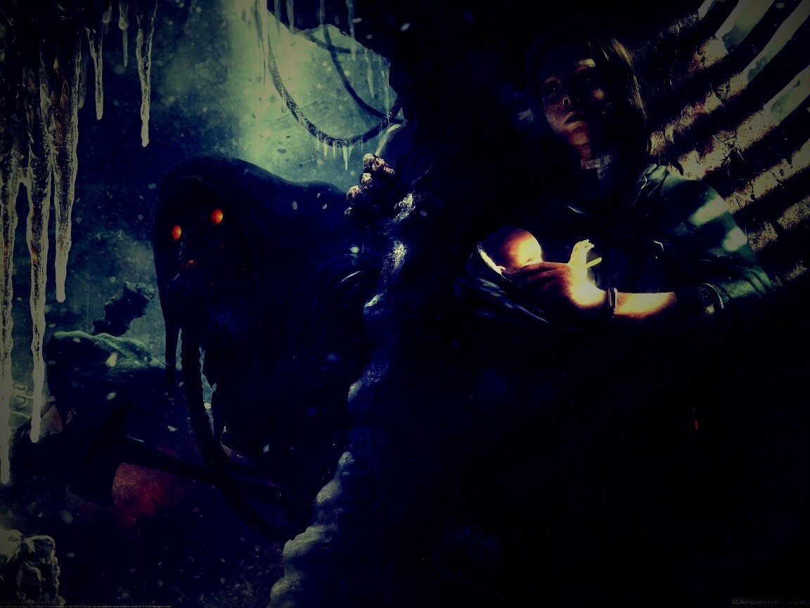 «Девушка с ребенком прячется от монстра»