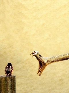«Змея-коряга напдает на птичку»