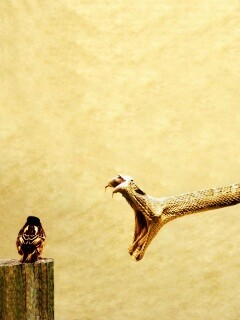 «Змея-коряга напдает на птичку»