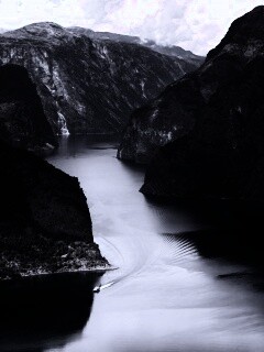 «Лодка на реке среди высоких гор»