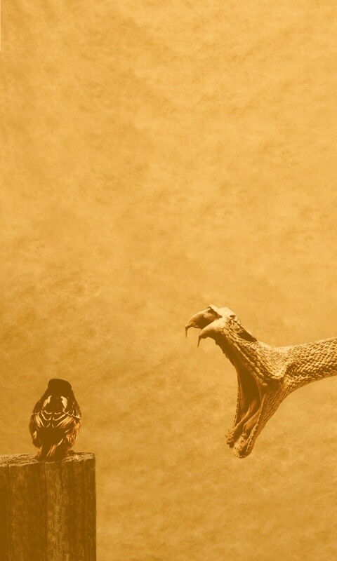«Змея-коряга напдает на птичку»
