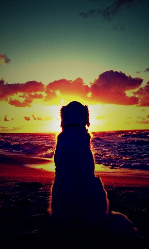 «Собака наблюдающая закат на пляже»