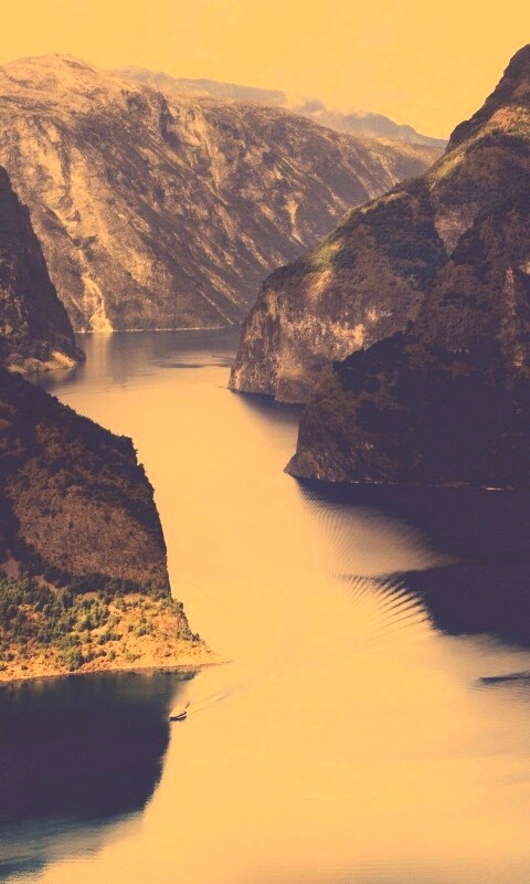 «Лодка на реке среди высоких гор»