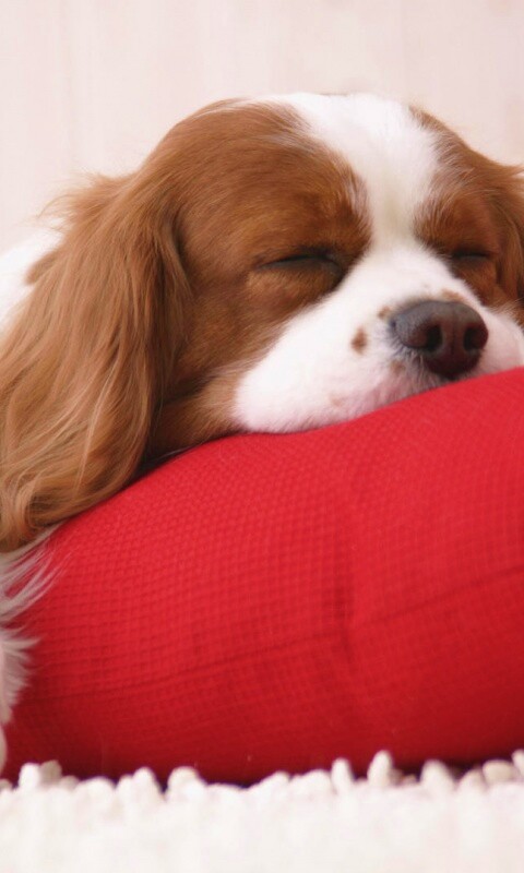 «Спящий щенок на красной подушке»