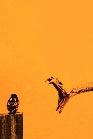«Змея-коряга напдает на птичку»