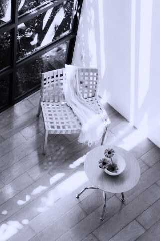 «Стул, столик и цветы в комнате»