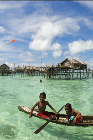 «Дети в лодке у поселения туземцев»