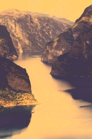 «Лодка на реке среди высоких гор»