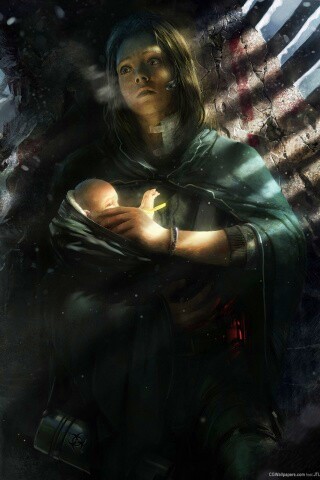 «Девушка с ребенком прячется от монстра»