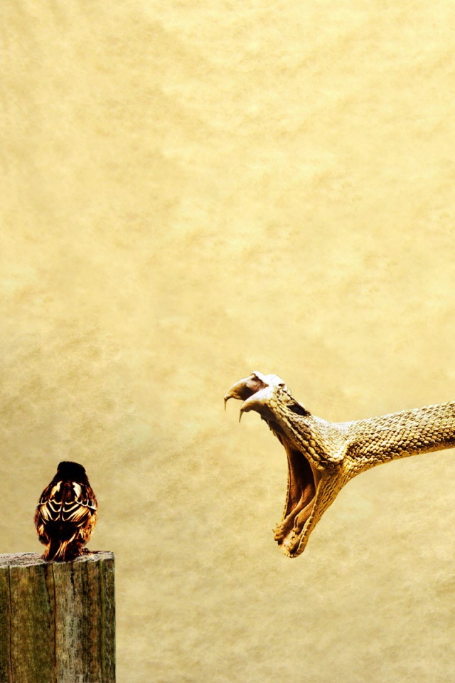 «Змея-коряга напдает на птичку»