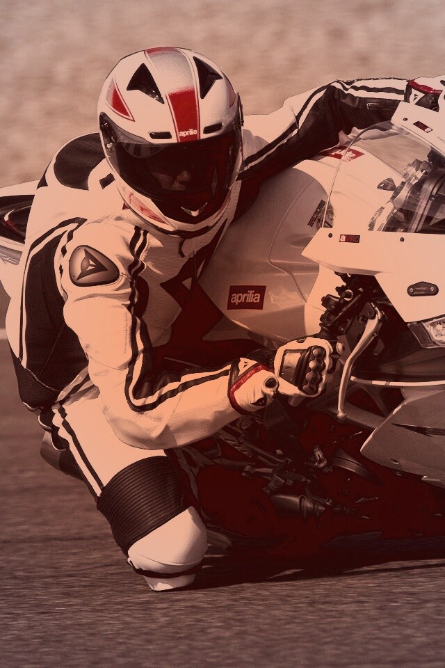 «Байкер в белой экиперовкена Априлия РСВ4»