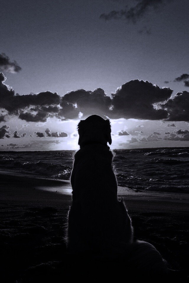«Собака наблюдающая закат на пляже»