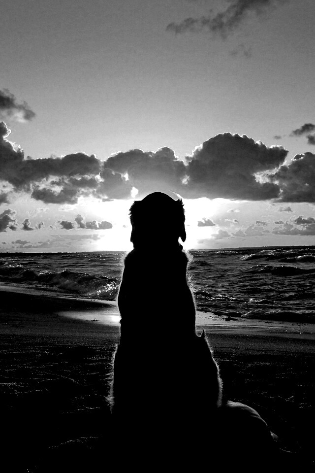 «Собака наблюдающая закат на пляже»