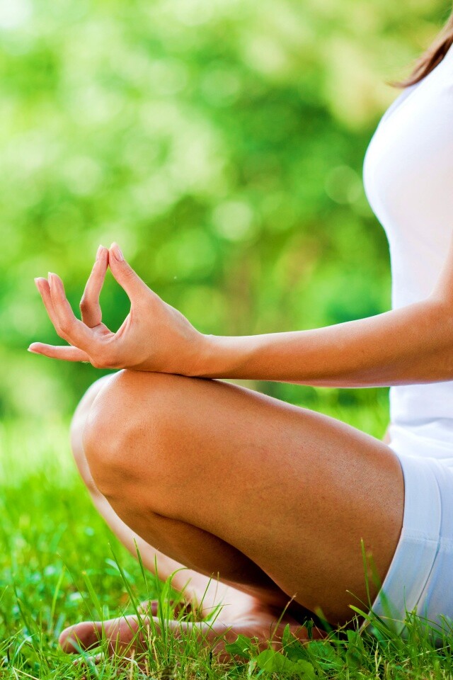 «Девушка медитирует в позе лотоса на траве»