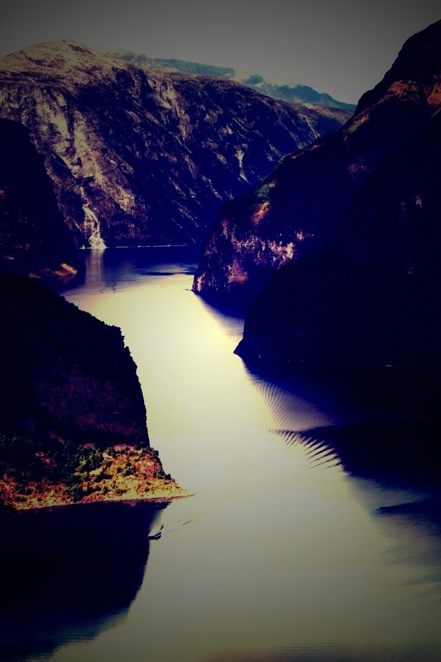 «Лодка на реке среди высоких гор»