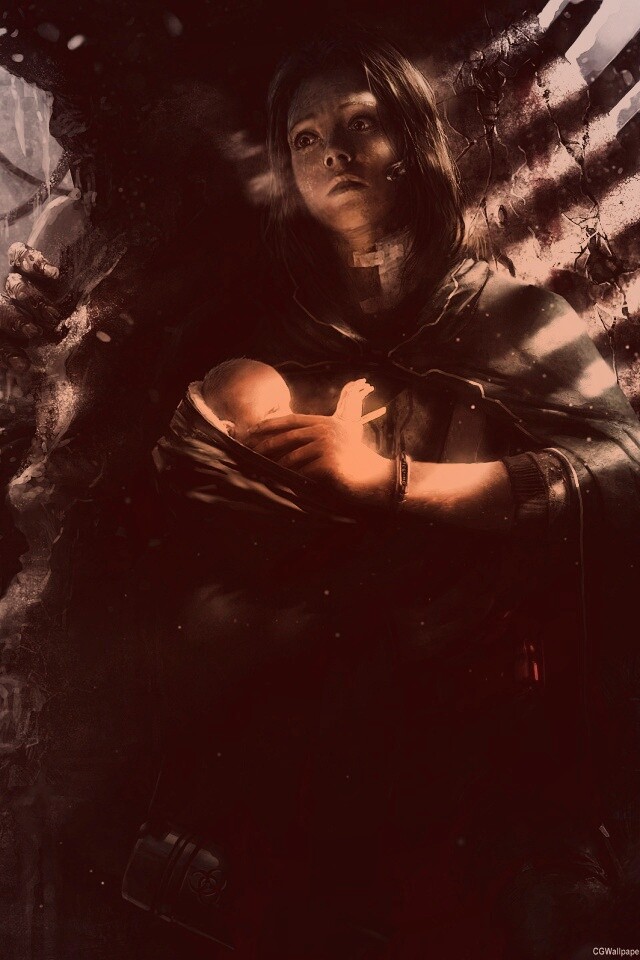 «Девушка с ребенком прячется от монстра»
