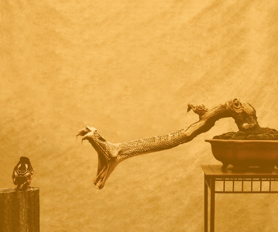 «Змея-коряга напдает на птичку»