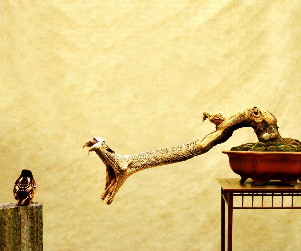 «Змея-коряга напдает на птичку»