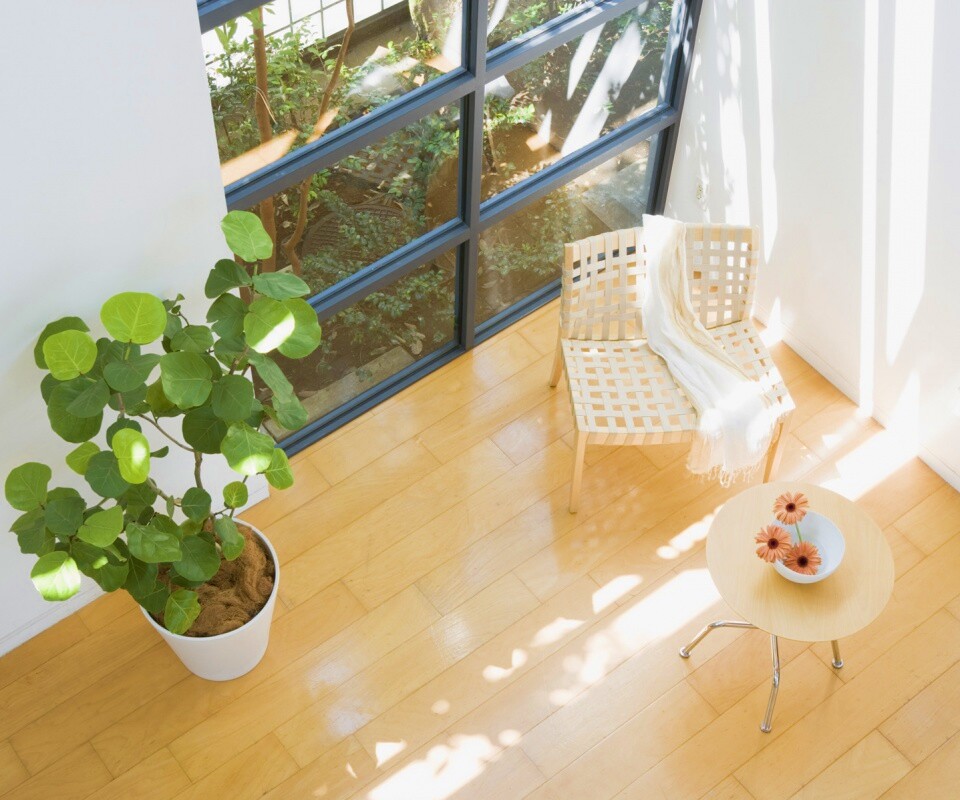 «Стул, столик и цветы в комнате»