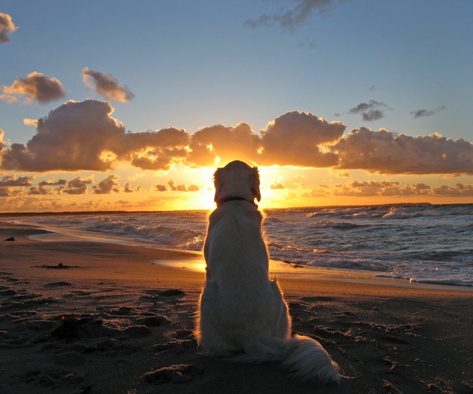 «Собака наблюдающая закат на пляже»