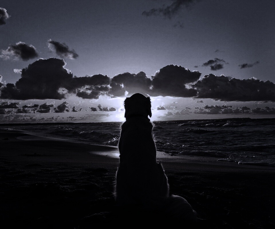 «Собака наблюдающая закат на пляже»