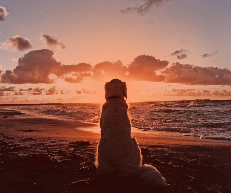 «Собака наблюдающая закат на пляже»