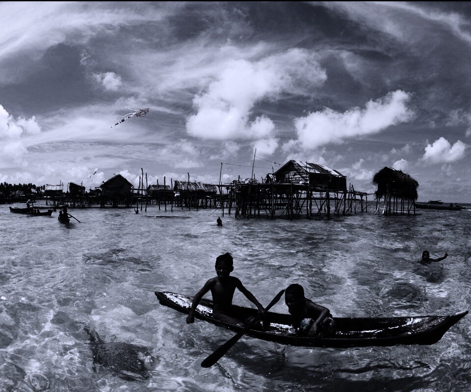 «Дети в лодке у поселения туземцев»