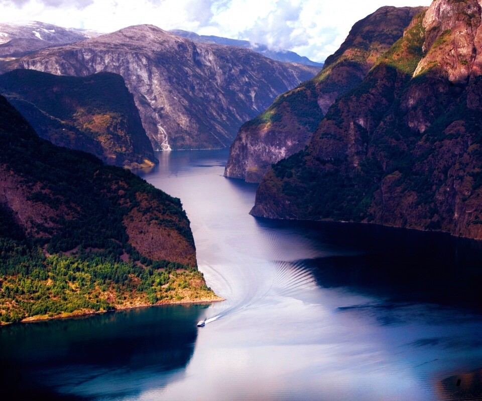 «Лодка на реке среди высоких гор»