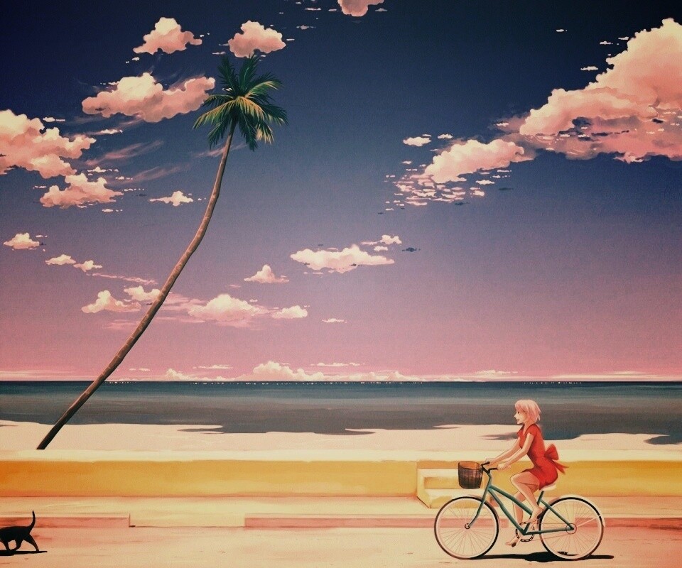 «Девушка едет на велосипеде вдоль берега»