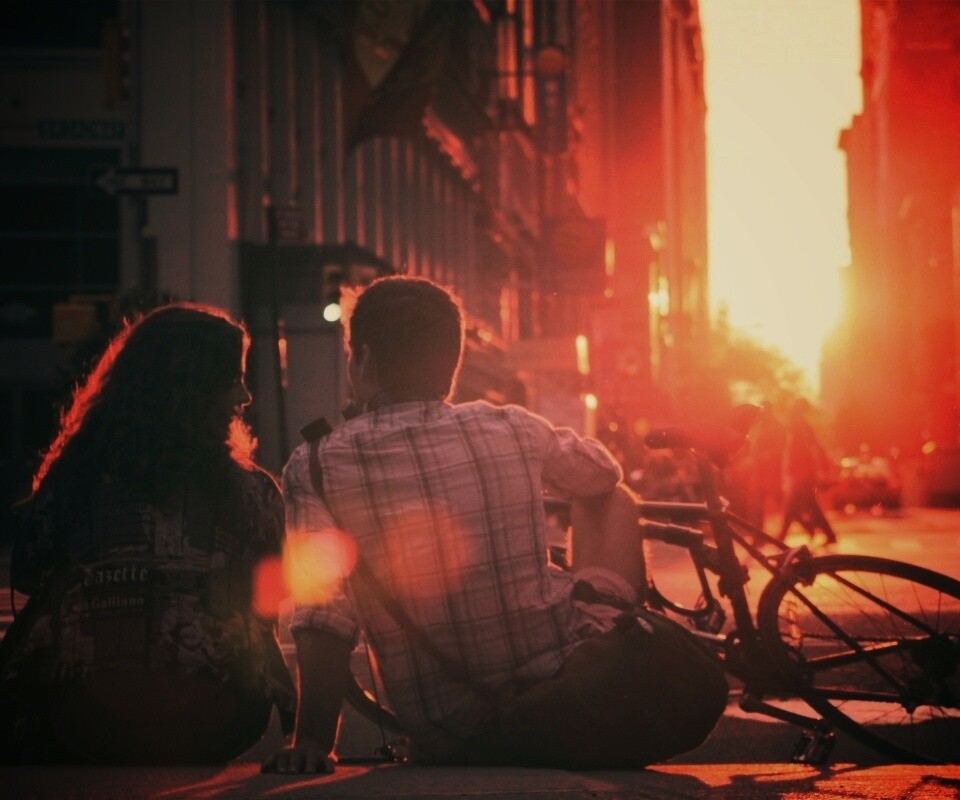 «Девушка и парень с велосипедом на закате»