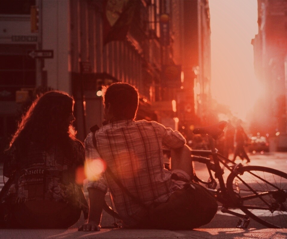 «Девушка и парень с велосипедом на закате»
