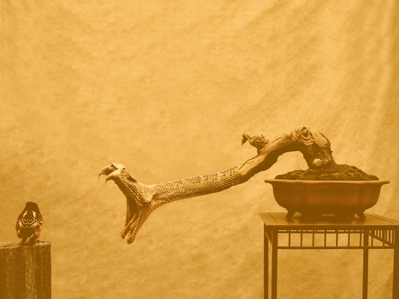 «Змея-коряга напдает на птичку»